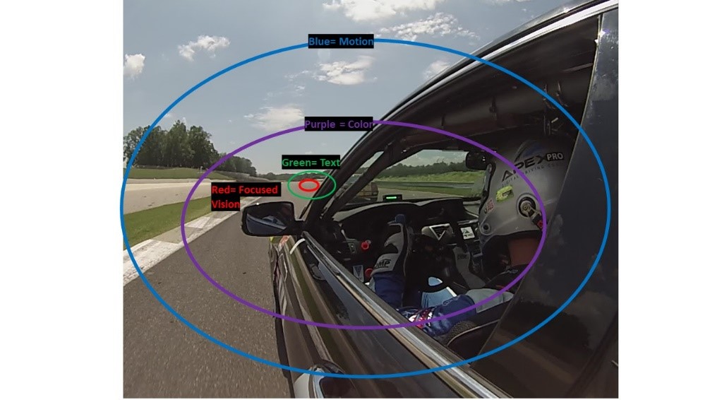 The above picture is a rough representation of what I’ll call our “peripheral detection zones.” The red oval on the pavement is my rough focal point. I’ve looked past my track-out point, planned my pass around the car ahead, and am now focused on the braking point for the next turn. Green represents the area in which I can accurately read text. So right now, even though I know the sticker on the center of my dashboard is white, blue, and black, I can’t actually read what it says. Purple represents the color detection zone. Within this oval, my vision can very accurately detect colors without focusing on the object. The blue oval represents my motion detection zone. If something moves anywhere in that blue oval, I’ll notice it. These zones are a little different for everyone, and this is a rough depiction based on what I have read and my personal experience.
