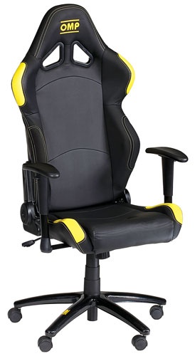 Adjustable seat height, seatback angle, and arm height. Supported on a swivel base with 5 casters for easy mobility. Black leatherette with yellow accents. And just like other OMP seats, the back has cutouts for shoulder harness belts. Some minor assembly required.